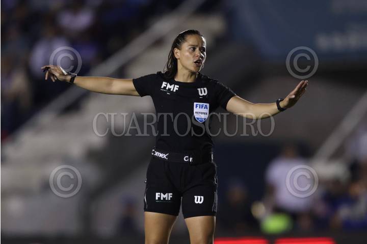CIUDAD DE MÉXICO, 06JULIO2024. La Árbitro Central, Karen Hernández pitó durante el partido de fútbol Cruz Azul vs Mazatlán FC correspondiente a la jornada 1 del Torneo Apertura 2024 de Liga BBVA MX, en el Estadio Ciudad de los Deportes. FOTO: EDGAR NEGRETE LIRA/CUARTOSCURO.COM