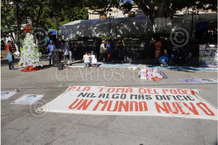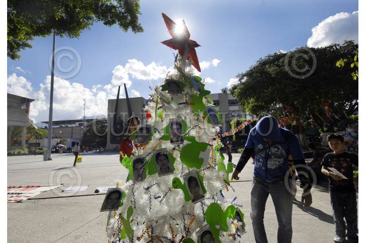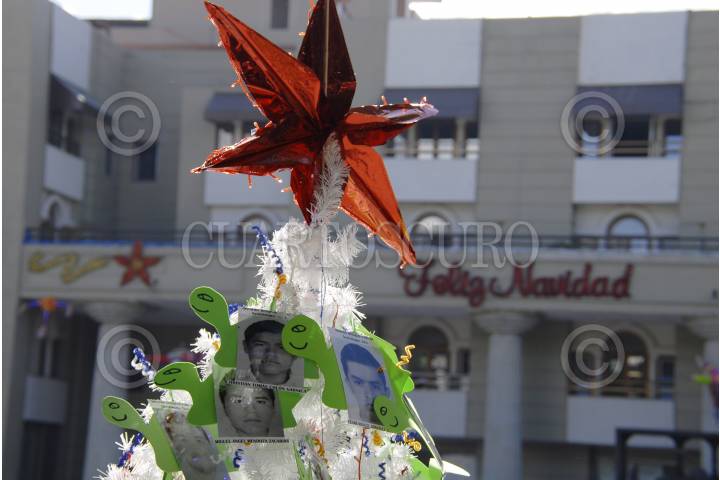 CILPANCINGO, GUERRERO. 16DICIEMBRE2017.- Estudiantes de la normal rural Raúl Isidro Burgos de Ayotzinapa, colocaron un árbol de Navidad con fotografías de los 43 desparecidos en Iguala en la plaza Primer Congreso de Anáhuac. FOTO: JOSÉ I. HERNÁNDEZ /CUARTOSCURO.COM