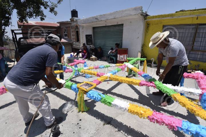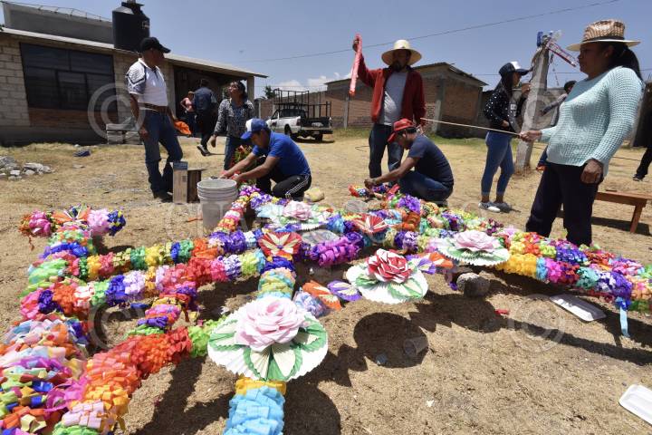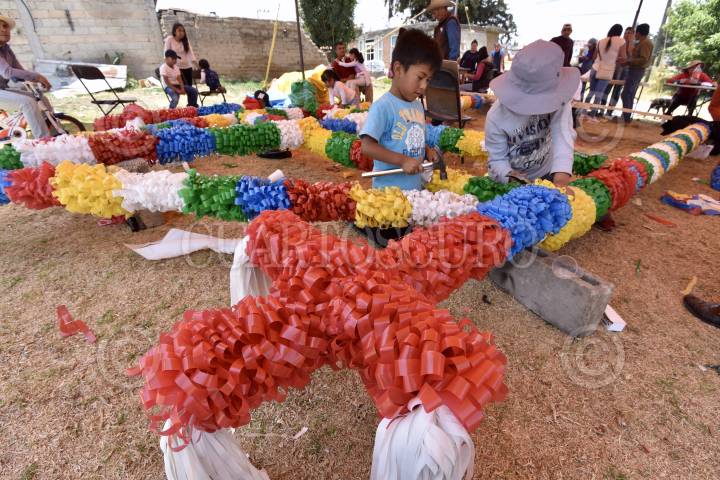 ALMOYA DE JUÁREZ, ESTADO DE MÉXICO, 01MAYO2019.- Pobladores de San Mateo Tlalchichilpan, municipio de Almoloya de Juárez, divididos en cuadrillas se encargan de adornar coloridos arcos de papel y plástico en honor a la virgen María, los que serán instalado en la iglesia principal de la comunidad cada 1 de Mayo, se pide un buen inicio del ciclo agrícola, el trabajo se realiza en un solo día. CRISANTA ESPINOSA AGUILAR /CUARTOSCURO.COM