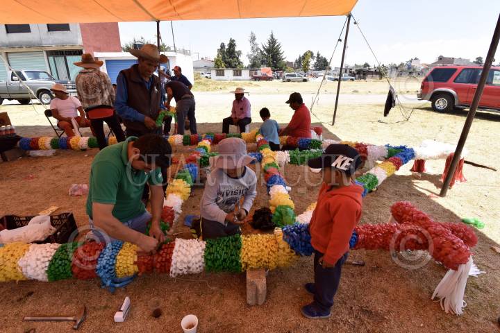 ALMOLOYA DE JUÁREZ, ESTADO DE MÉXICO, 01MAYO2025.- Habitantes de San Mateo Tlachichilpan, delegación de Almoloya de Juárez, tratan de mantener sus tradiciones vivas, una de ellas es la celebración del Mes de la Virgen María; mujeres, hombres y niños trabajan desde muy temprana hora en la elaboración de arcos en honor a la Virgen, que durante todo el mes de Mayo se festeja; 11 cuadrillas en el pueblo trabajan durante el día para posteriormente llevar las portadas a la iglesia de la localidad y así adornen la fachada. En un inicio de la tradición los arcos eran elaborados con flores y pencas de maguey, posteriormente se comenzó a utilizar papel china y actualmente los elaboran con plástico de colores para que duren más tiempo, llegan a medir de 5 a 6 metros de alto y más de 4 metros de ancho. FOTO: CRISANTA ESPINOSA AGUILAR/CUARTOSCURO.COM