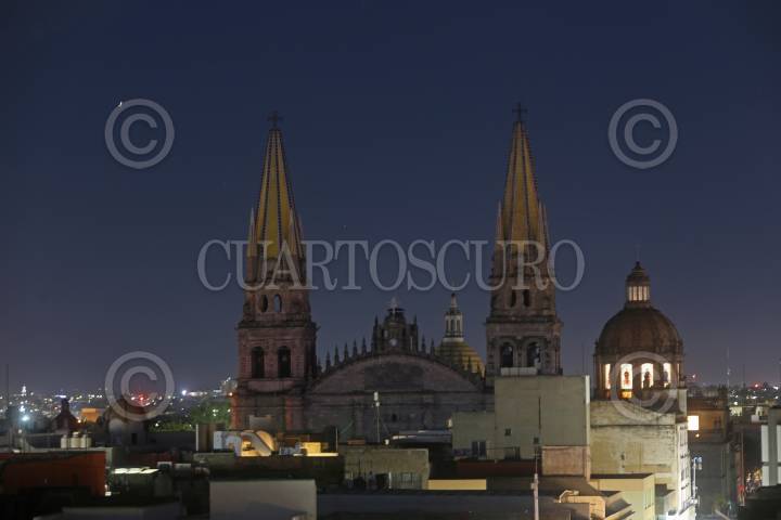 GUADALAJARA, JALISCO, 30MARZO2019.- La Catedral Metropolitana, los Arcos de Guadalajara, la Glorieta de los Caballos y el Puente Matute Remus se unieron este sábado a la hora del Planeta y al igual que otros monumentos emblemáticos del mundo y apagaron sus luces para crear conciencia sobre el cambio climático. FOTO FERNANDO CARRANZA GARCIA / CUARTOSCURO.COM