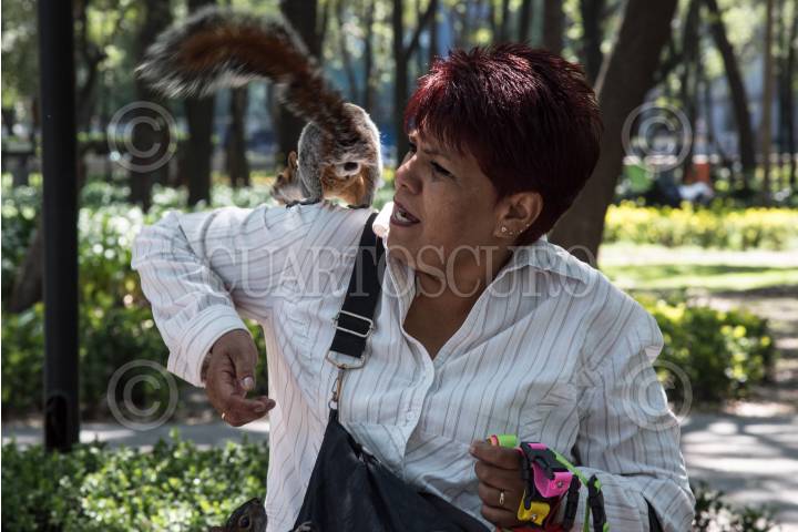CIUDAD DE MÉXICO, 20JUNIO2017.- Una ardilla se le arrojó al hombro a una vendedora ambulante en los patios del Castillo de Chapultepec. FOTO: TERCERO DÍAZ /CUARTOSCURO.COM