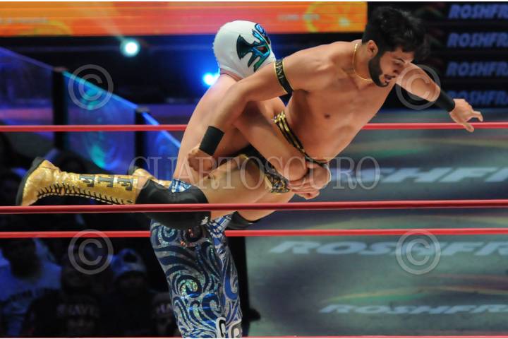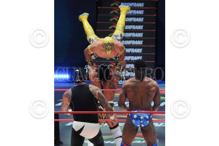 CIUDAD DE MÉXICO, 18AGOSTO2024. - Kemalito salta sobre el luchador inglés, Flip Gordon, durante la lucha estelar México Vs Resto del Mundo. FOTO: DANIEL AUGUSTO /CUARTOSCURO.COM