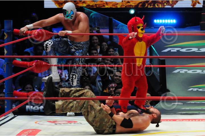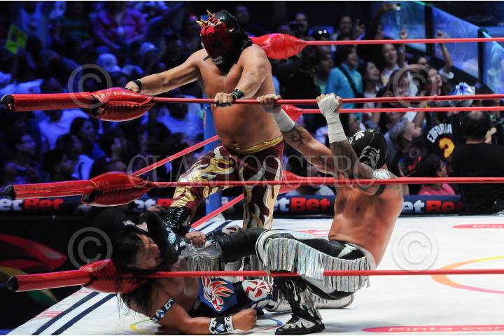 CIUDAD DE MÉXICO, 18AGOSTO2024. - Mephisto y Magnus someten al Último Guerrero durante su encuentro de esta noche. FOTO : DANIEL AUGUSTO /CUARTOSCURO.COM