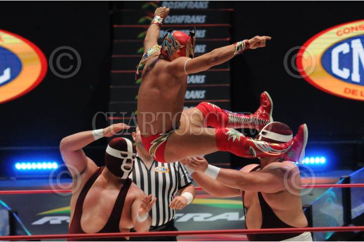 CIUDAD DE MÉXICO, 18AGOSTO2024. - El luchador Fugaz golpea a los Gemelos Diablo durante su encuentro de esta noche en la Arena México. FOTO: DANIEL AUGUSTO /CUARTOSCURO.COM