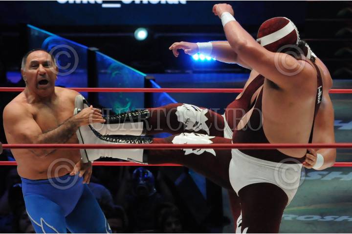 CIUDAD DE MÉXICO, 18AGOSTO2024. - Blue Panther es golpeado por los Gemelos Diablo durante su encuentro esta noche en la Arena México. FOTO: DANIEL AUGUSTO /CUARTOSCURO.COM