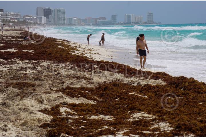 Turistas caminan frente al sargazo que afecta Playa Marin durante sus vacaciones
