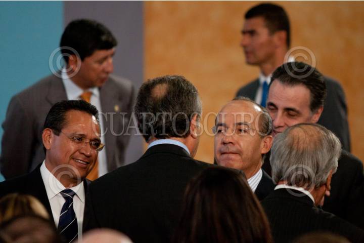 MÉXICO, D.F., 17JUNIO2011.- Juan Manuel Oliva, gobernador de Guanajuato, Felipe Calderón Hinojosa, Presidente de los Estados Unidos Mexicanos, y Bruno Ferrari, Secretario de Economía, al finalizar el anuncio de inversión por 500 millones de dólares que la empresa automotriz Mazda en conjunto con Sumitomo Corporation destinarán en la construcción de una planta de vehículos y motores en Salamanca, Guanajuato. FOTO: MOISÉS PABLO/CUARTOSCURO.COM