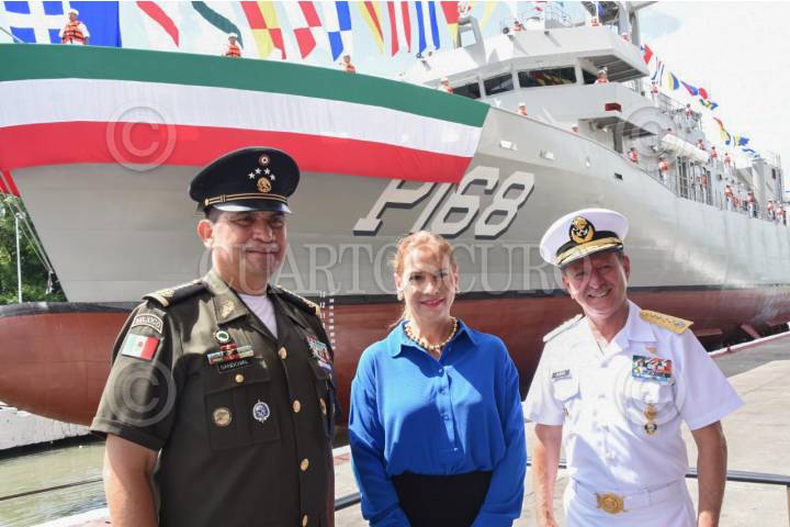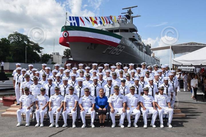 TAMPICO, TAMAULIPAS, 20JULIO2019.- La Secretaría de Marina-Armada de México realizó la Botadura de la Patrulla Oceánica ARM “TABASCO” PO-168, que llevará a cabo sus operaciones para efectuar patrulla y vigilancia dentro del mar territorial y la Zona Económica Exclusiva, con el fin de mantener el Estado de Derecho en la mar. La ceremonia de la botadura de esta unidad fue presidida por el Almirante José Rafael Ojeda Durán, Secretario de Marina y Alto Mando de la Armada de México, quien estuvo acompañado por la Doctora Beatriz Gutiérrez Müller, el General Luis Crescencio Sandoval González, Secretario de la Defensa Nacional; Licenciado Francisco Javier García Cabeza de Vaca, Gobernador del Estado de Tamaulipas, así como de autoridades navales, civiles y militares. FOTO: SEMAR /CUARTOSCURO.COM
