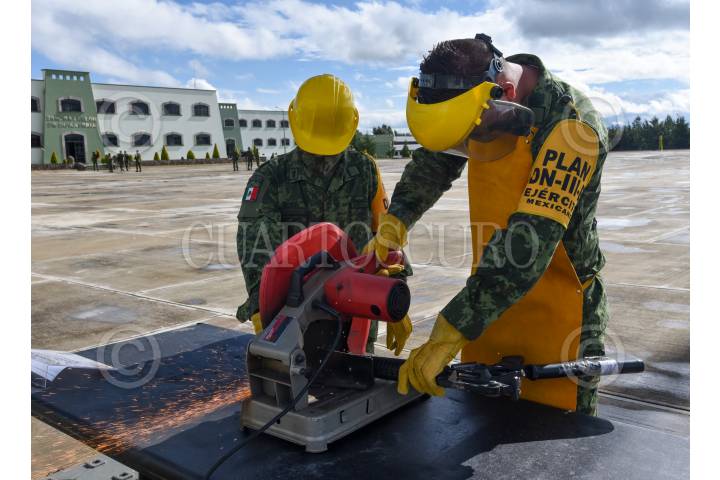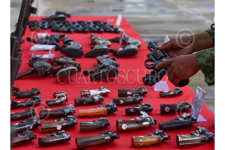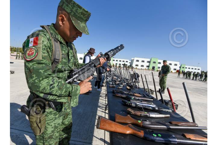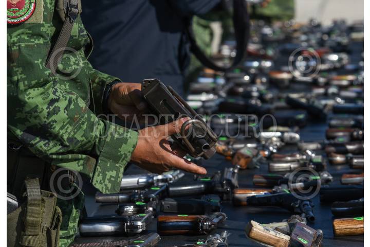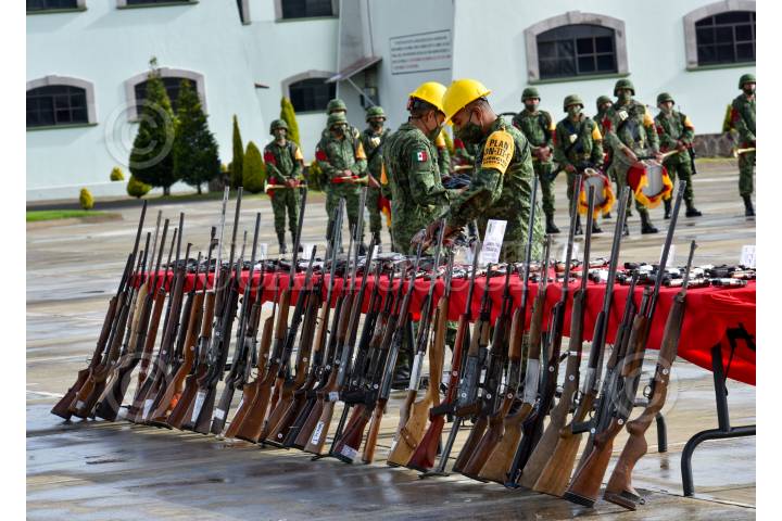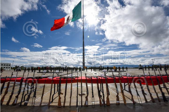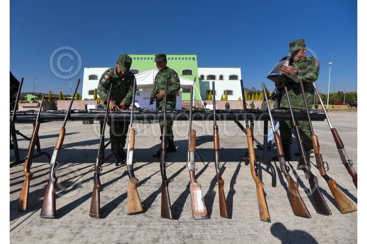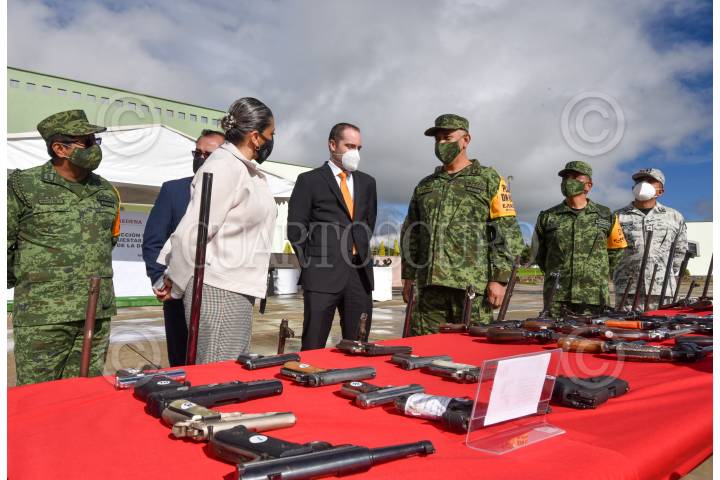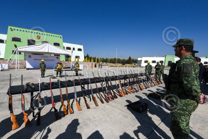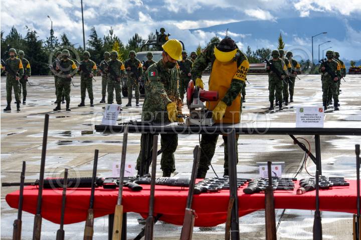 El General de brigada Diplomado de estado Mayor Francisco Jesús Leana Ojeda Comandante de la 22/a Zona Militar, Inspector de la Guardia Nacional Juan Gabriel Godínez Olvera , Rodrigo Sigfrid Martínez Celis Wogau, Secretario de Seguridad Pública del Estado de México encabezaron la ceremonia de destrucción de armas de fuego aseguradas y puestas a disposición de la Secretaria de la Defensa Nacional.