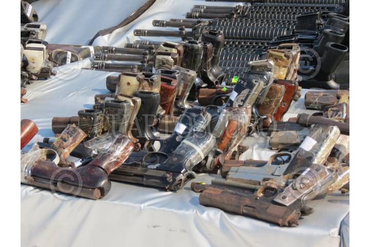 ACAPULCO, GUERRERO, 14MARZO2018.- En ceremonia efectuada en la Explanada del 56 Batallón de Infantería de la Novena Región Militar, en Cumbres de Llano Largo, el Ejército Mexicano destruyó armamento decomisado en operativos realizados recientemente contra el crimen, así como el recibido durante la campaña de canje de armas emprendida por las fuerzas armadas en la entidad. En esta ocasión fueron destruidas 657 armas largas y 355 armas cortas, que representan el resultado del decomiso efectuado en diversas acciones de las autoridades. La autoridad castrense explicó que la destrucción se lleva a cabo de acuerdo al tipo de material, las partes de madera y plástico son incinerados, mientras que las partes de metálicas son enterradas en cemento. FOTO: CUARTOSCURO.COM