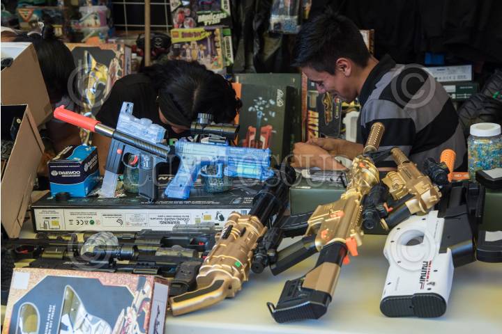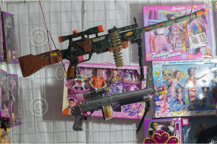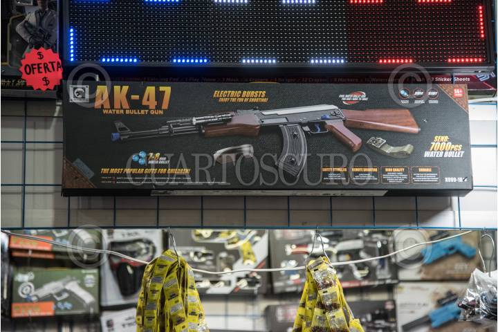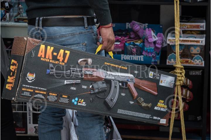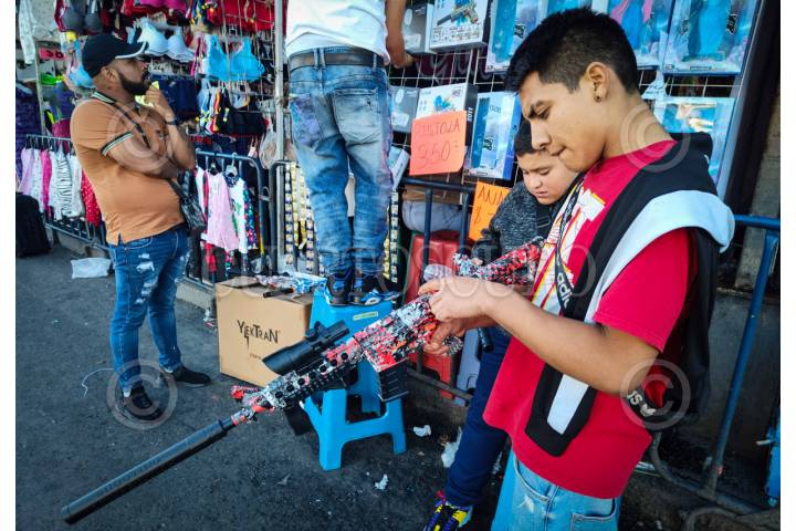 CIUDAD DE MÉXICO, 04ENERO2024.- Los juguetes bélicos son de los más vendidos en las calles de Eje 1, Manuel Doblado y del Carmen, en el marco de las compras para el Día de Reyes. Su costo va de los 750 a 1000 pesos para las armas de juguete grandes, mientras de 250 a 450 para las más chicas, ambas cuentan con carga de "bolitas de hidrogel". Pese a que las autoridades capitalinas por varios han llevado a cabo el programa “Sí al Desarme, Sí a la Paz” en el cuañ se intercambian juguetes bélicos por didácticos, la venta de éstos últimos continúa a la alza. FOTO: MARIO JASSO /CUARTOSCURO.COM