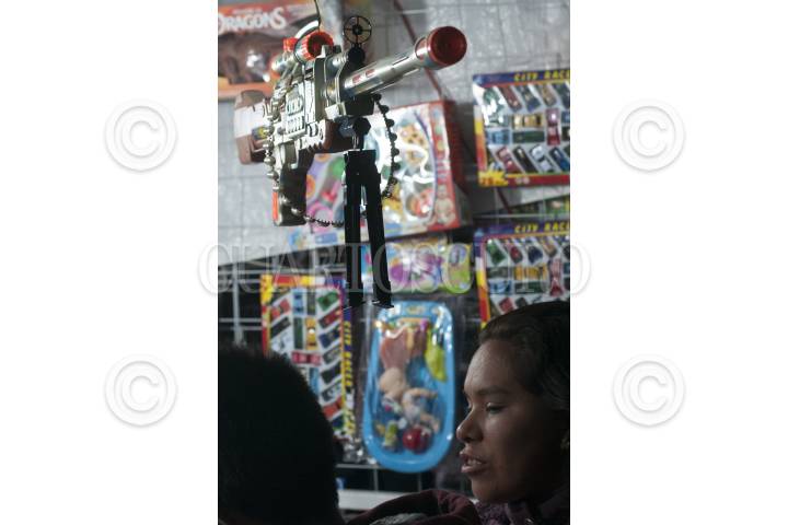 TEXCOCO, ESTADO DE MÉXICO, 03ENERO2013.- Armas de plástico destacan entre los comerciantes de Texcoco que ya instalaron puestos con juguetes en la explanada municipal para que los padres acudan a comprar y regalar a sus hijos el 6 de enero, día de los Reyes Magos. Los precios de las armas fluctúan entre 200 y 300 pesos. Los comerciantes exigen a las autoridades permitir instalarse en el lugar donde tradicionalmente ponen sus puestos ya que hay temor de que los granaderos los desalojen del jardín municipal. FOTO: DIEGO SIMÓN SÁNCHEZ /CUARTOSCURO.COM