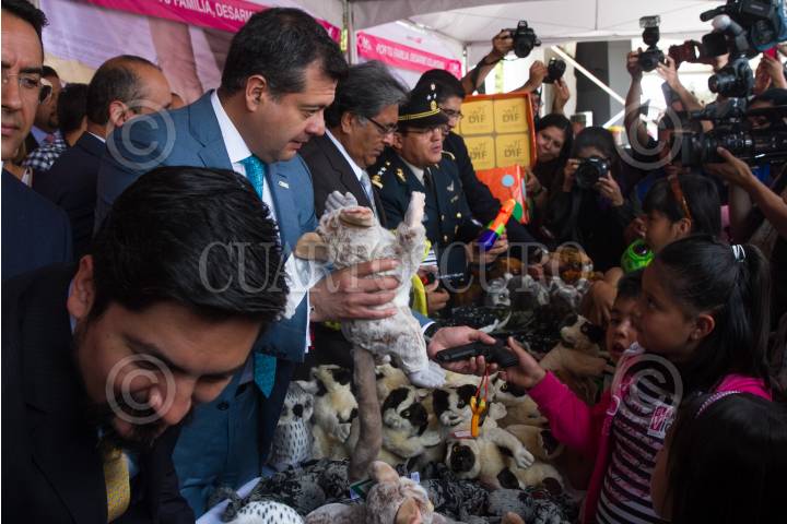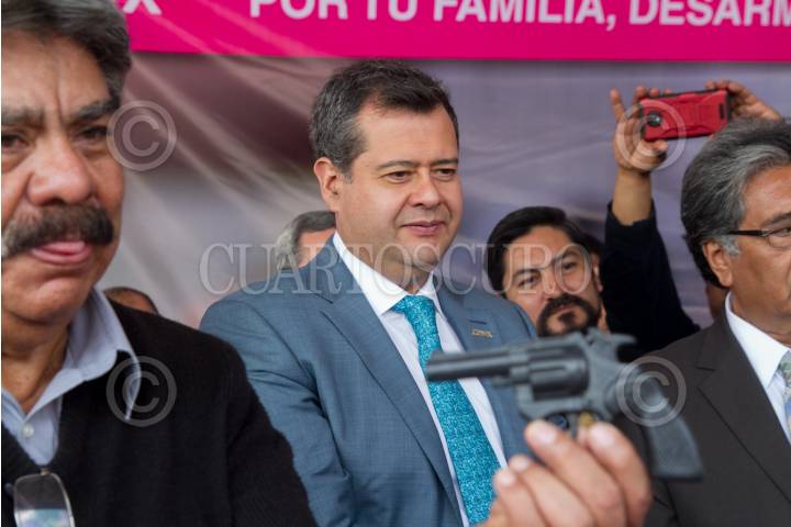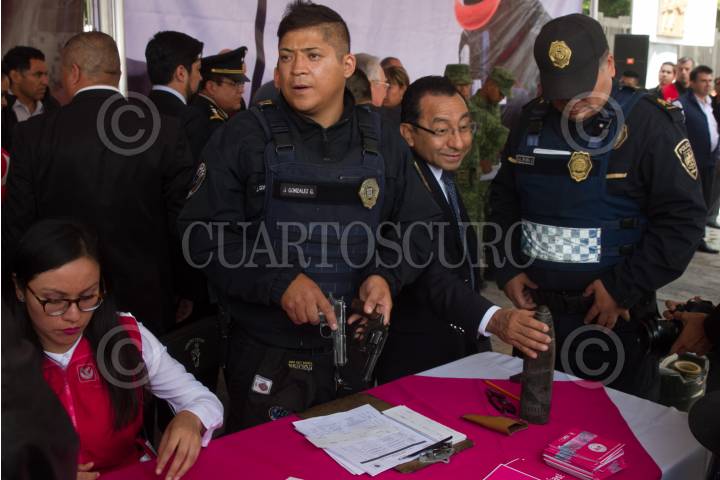 CIUDAD DE MÉXICO, 30JULIO2018.- José Ramón Amieva, Jefe de Gobierno, encabezó una jornada más del programa "Por tu familia, desarme voluntario", en la cual acudieron decenas de niños acompañados de sus padres a intercambiar sus juguetes bélicos por juguetes didácticos. En esta ocasión también se implementó la modalidad en la cual autoridades delegacionales podían acudir a los domicilios de las personas dispuestas a deshacerse de sus armas de fuego, por cada pieza se da dinero en efectivo, para que posteriormente elementos del Ejercito las inutilizarán. FOTO: MOISÉS PABLO /CUARTOSCURO.COM