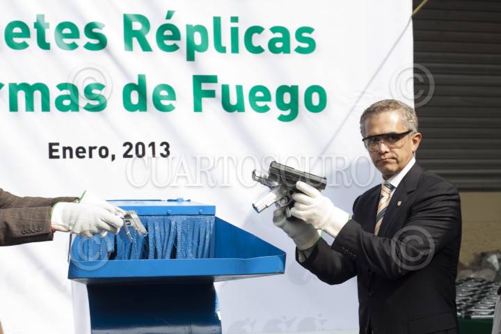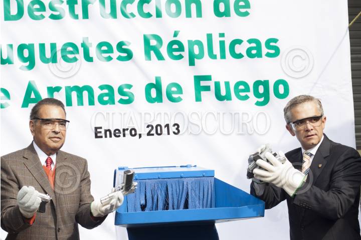 MÉXICO, D.F., 04ENERO2013.- Miguel Ángel Treviño, titular de la Procuraduria Federal del Consumidor, y Miguel Ángel Mancera, Jefe de Gobierno, encabezaron la destrucción de juguetes réplicas de armas de fuego. FOTO: MOISÉS PABLO / CUARTOSCURO.COM