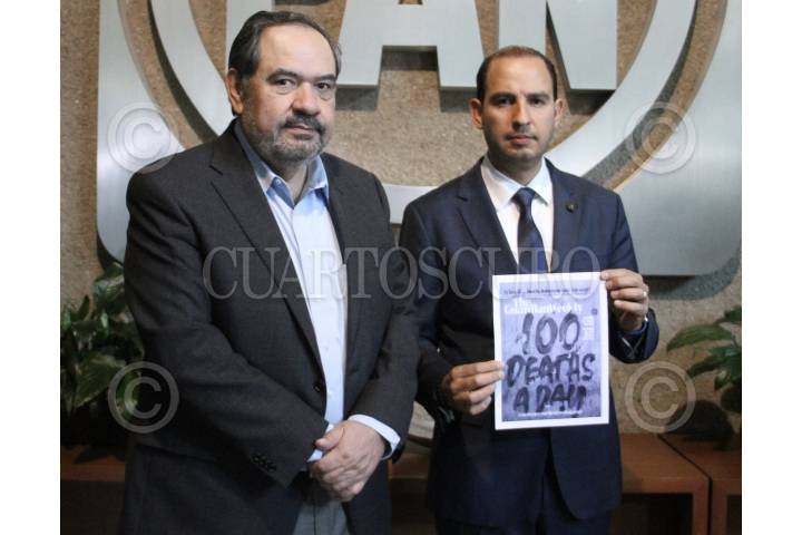 CIUDAD DE MÉXICO, 06NOVIEMBRE.- Marko Cortés, líder Nacional del Partido Acción Nacional y Héctor Larios, Secretario General, durante la conferencia de prensa en donde exigió que Estados Unidos asuma su responsabilidad en el tema de tráfico de armas hacia nuestro país, así mismo hablo sobre las afectaciones que tiene el populismo en la sociedad mexicana. FOTO: ROGELIO MORALES /CUARTOSCURO.COM