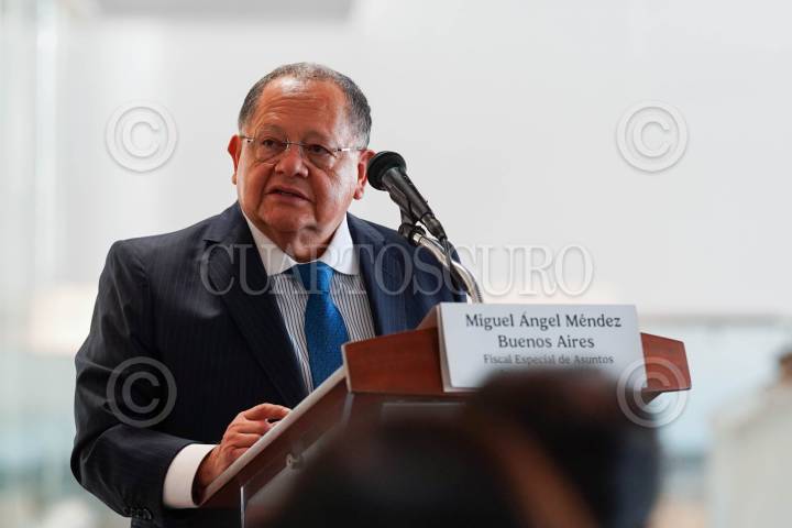 CIUDAD DE MÉXICO, 11DICIEMBRE2024.- Miguel Ángel Méndez, fiscal especial de asuntos Jurídicos e Internacionales, durante la entrega-recepción de seis piezas arqueológicas recuperadas por decomiso y una escultura de Santa Rosa de Lima, robada de la iglesia de Epazoyucan, en Hidalgo en las inmediaciones del Museo del Templo Mayor. FOTO: GALO CAÑAS/CUARTOSCURO.COM
