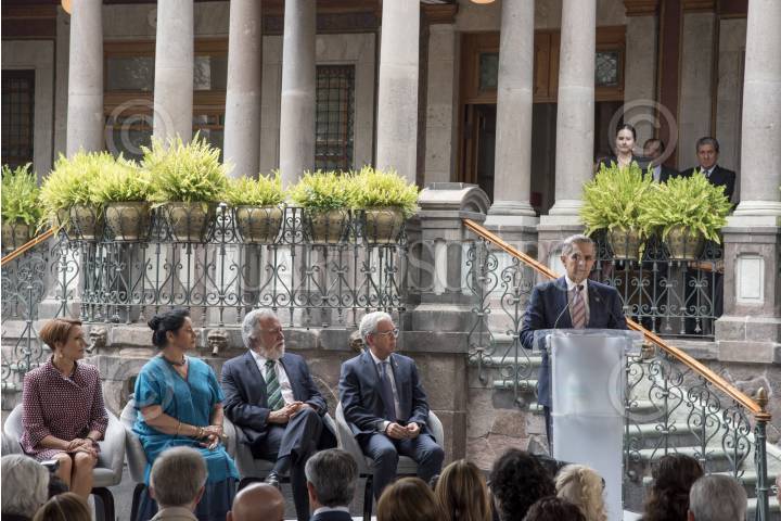CIUDAD DE MÉXICO, 23SEPTIEMBRE2016.- Autoridades del Colegio de México, acompañados de María Cristina Cepeda titular del INBA y Rafael Tovar y de Teresa, Secretario de Cultura, durante el homenaje póstumo al arquitecto Teodoro González de León realizado en la explanada del Colegio de México. FOTO: SAÚL LÓPEZ /CUARTOSCURO.COM