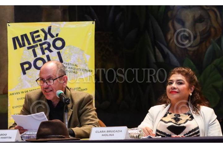 CIUDAD DE MÉXICO, 19SEPTIEMBRE2024.- Eduardo Vázquez Martín, Coordinador Ejecutivo de San Ildefonso, y Clara Brugada, jefa de gobierno electa de la Ciudad de México, durante la conferencia de la edición 2024 del festival de arquitectura Mextropoli. FOTO: CUARTOSCURO.COM
