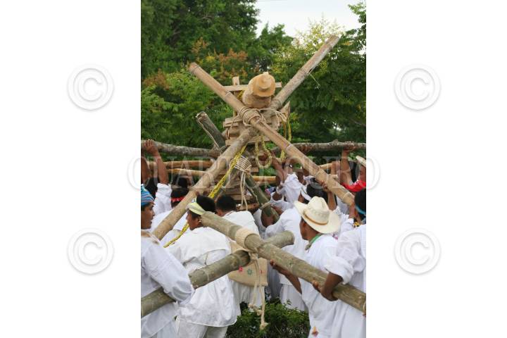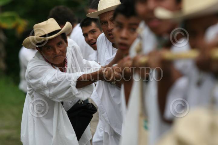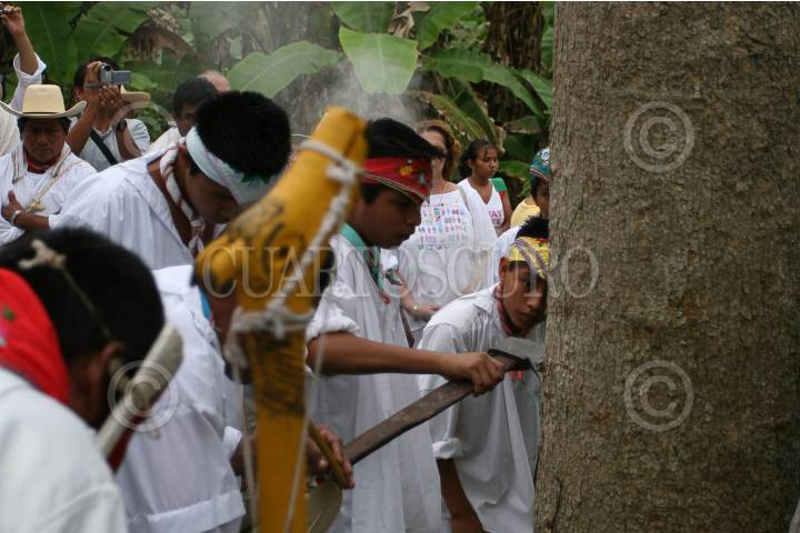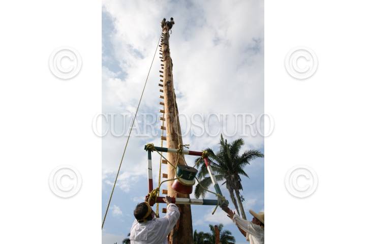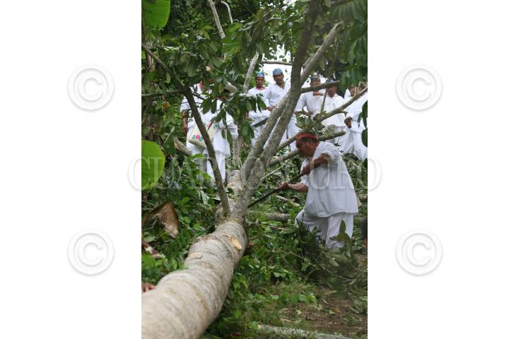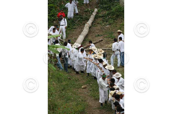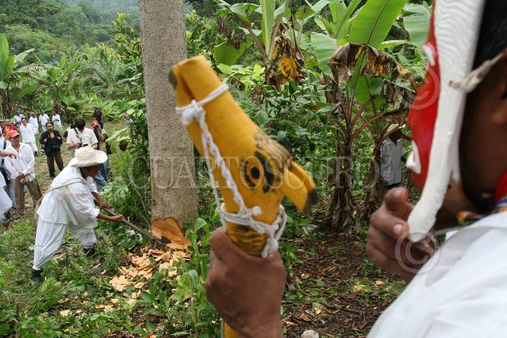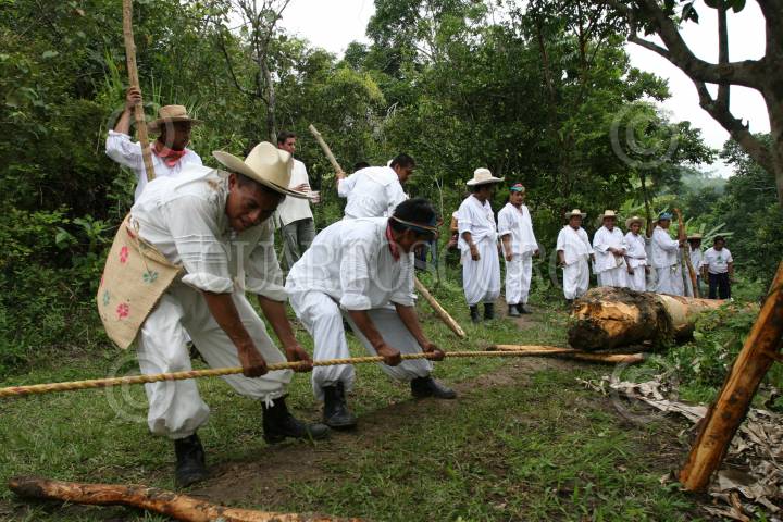 PAPANTLA, VERACRUZ, 22SEPTIEMBRE2008.- Integrantes del pueblo Totoanca, realizaron el corte y arrastre del Palo Volador, ceremonia sagrada de este pueblo, la cual consiste en buscar el árbol que derribaran para que posteriormente después de un ritual y de ser colocado el tronco concluya con el vuelo de los niños que integran en este caso la escuela que se encuentra en el Parque Temático Takilhsukut, lugar donde fue colocado este palo volador. FOTO: GUILLERMO PEREA/CUARTOSCURO.COM