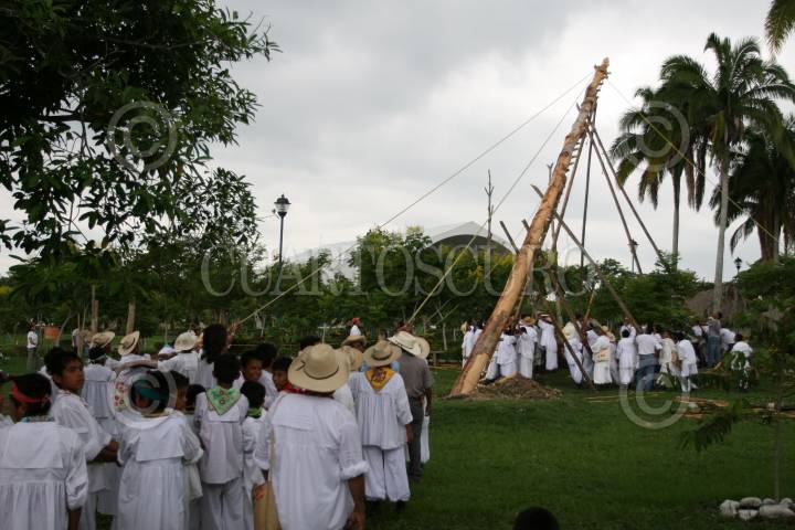 PAPANTLA, VERACRUZ, 22SEPTIEMBRE2008.- Integrantes del pueblo Totonaca, realizaron el corte y arrastre del Palo Volador, ceremonia sagrada de este pueblo, la cual consiste en buscar el árbol que derribaran para que posteriormente después de un ritual y de ser colocado el tronco concluya con el vuelo de los niños que integran en este caso la escuela que se encuentra en el Parque Temático Takilhsukut, lugar donde fue colocado este palo volador. FOTO: GUILLERMO PEREA/CUARTOSCURO.COM