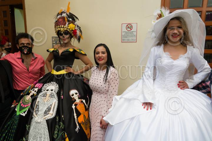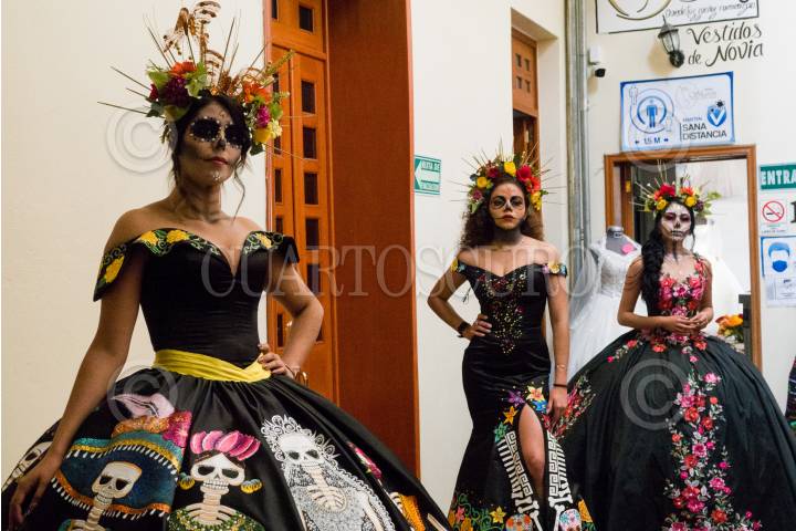 Modelos posan con vestidos temáticos de Día de Muertos con motivo de la inauguración de la ofrenda monumental con el tema de Muertes por Covid-19 en el inmueble de República de Chile 13 con motivo del inicio del Festival de Ofrendas y Arreglos Florale