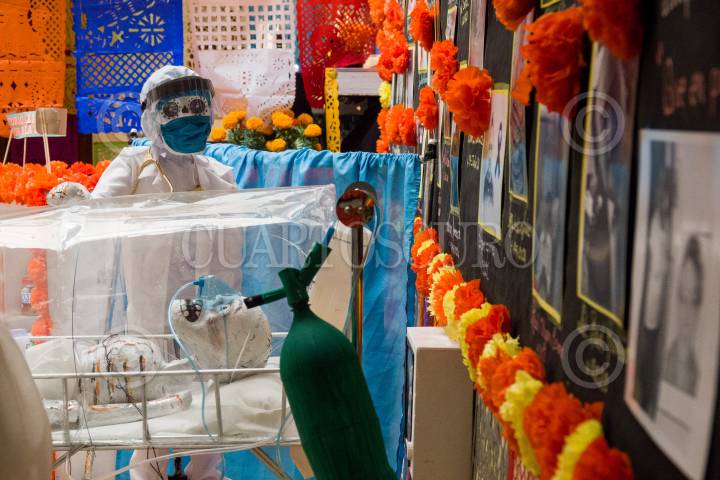 Aspectos de la ofrenda monumental con el tema de Muertes por Covid-19 en el inmueble de República de Chile 13 con motivo del inicio del Festival de Ofrendas y Arreglos Florales del Centro Histórico.