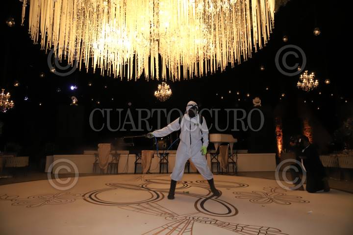 A pesar de que integrantes de la sección 22 irrumpieron en donde se llevaría a cabo la boda de la ex lideresa del magisterio Elba Esther Gordillo y el abogado Luis Antonio Lagunas Gutiérrez, el encargado de sanitizar el lugar, continúo trabajando.
