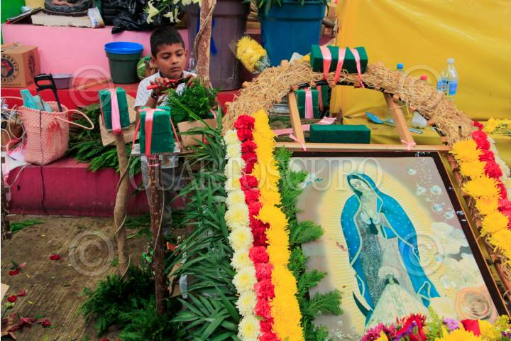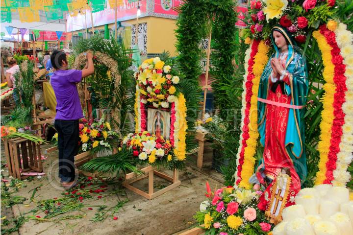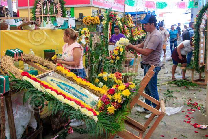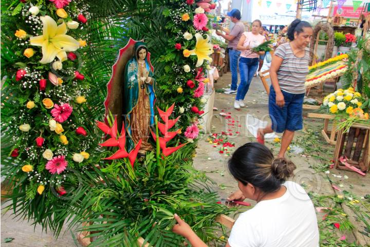 Trabajadores de arreglos florales del Mercado Central de Acapulco trabajan en las decoraciones para los festejos a la Virgen de Guadalupe.
