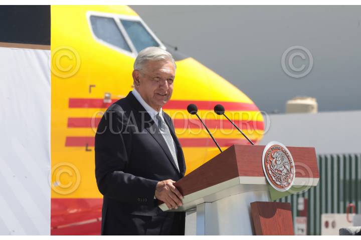 Andrés Manuel López Obrador, presidente de México, presidió el arribo del primer vuelo de carga de la empresa DHL en el Hangar 3 de Servicios Aeroportuarios del Aeropuerto Internacional “Felipe Ángeles” (AIFA).