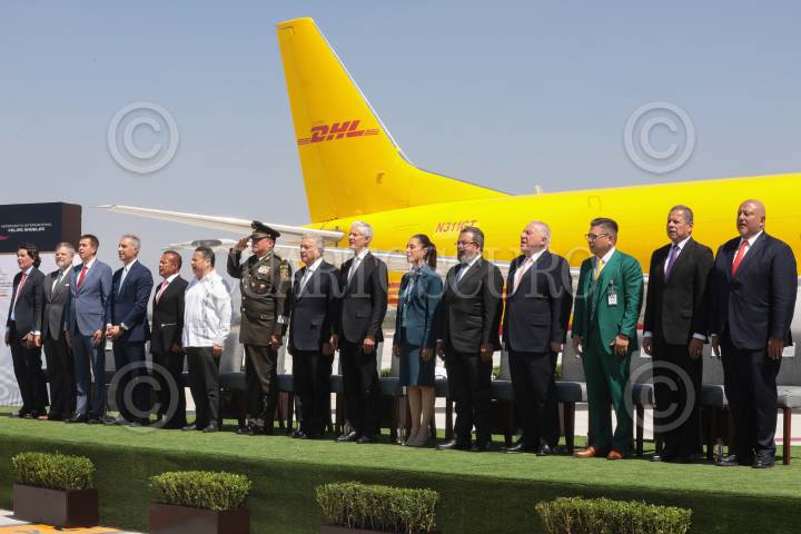 Andrés Manuel López Obrador, presidente de México; Luis Cresencio Sandoval, secretario de la Defensa Nacional; Claudia Sheinbaum, jefa de Gobierno; Alfredo del Mazo, gobernador del Estado de México; Julio Menchaca, y directivos de la empresa DHL, encabezaron la ceremonia de arribo del primer vuelo de carga en el Aeropuerto Internacional Felipe Ángeles (AIFA).