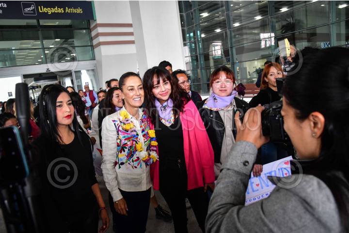 Claudia Sheinbaum, aspirante a coordinadora nacional de los comités de defensa de la Cuarta Transformación, durante su llegada al Aeropuerto Internacional Felipe Ángeles (AIFA) luego de su gira de asamblea informativa realizada ayer en Monterrey.