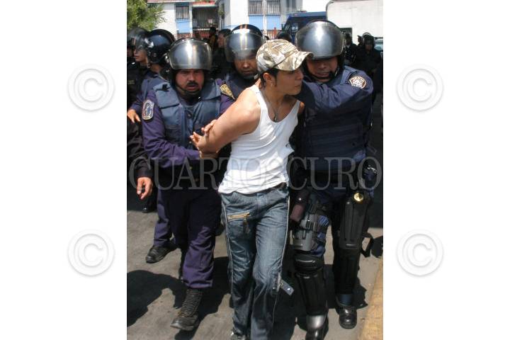MÉXICO, D.F., 12MARZO2009.- Estudiantes de la Prepa 2 se enfrentaron con los estudiantes del Bachilleres Iztacalco sobre avenida Tezontle y Churubusco por lo que realizaron disturbios en la estacion del Metro Apatlaco en la linea Verde que corre de Garibaldi a Constitución de 1917. En la que arrojaron un boiler a las vias por lo que fueron detenidos dos de los estudiantes como presuntos responsables de este hecho. FOTO: LUIS CARBAYO/CUARTOSCURO.COM