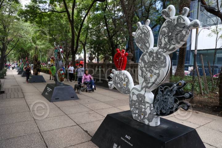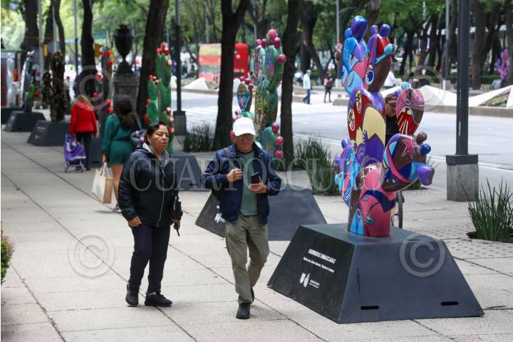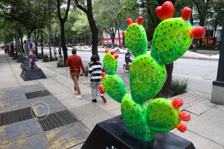CIUDAD DE MÉXICO, 29JUNIO2025.- Capitalinos disfrutan de las piezas intervenidas por diferentes artistas que conforman la exposición “Nopalera en el Corazón”, que se encuentra en Paseo de la Reforma. FOTO: MOISÉS PABLO/CUARTOSCURO.COM