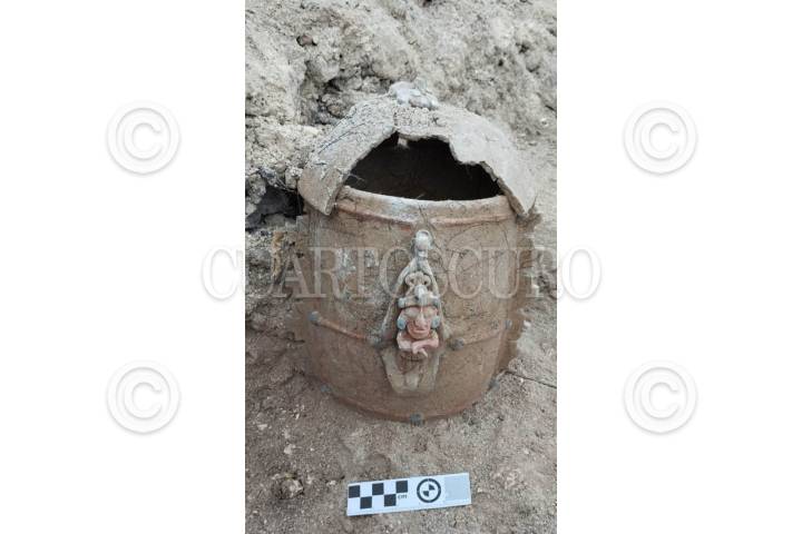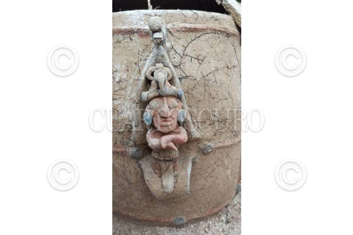CIUDAD DE MÉXICO, 08ENERO2024.- Como parte de las labores de salvamento arqueológico que realiza la Secretaría de Cultura del Gobierno de México, a través del Instituto Nacional de Antropología e Historia (INAH), en las obras del Tramo 7 del Tren Maya, especialistas localizaron una urna funeraria con la representación del dios del maíz. Al participar en la conferencia de prensa matutina del presidente de México, Andrés Manuel López Obrador, el director general del INAH, Diego Prieto Hernández, informó que, en cuanto a su tipología, esta urna ha sido identificada como una vasija estilo Paaktzatz. El antropólogo detalló que el elemento fue ubicado junto a otra vasija de igual tipología, por lo que se piensa que formó parte de una ofrenda fundacional, debido a su asociación con un inmueble prehispánico: “Se trata de una olla de barro crudo que contiene los restos mortales de una persona”. FOTO: INAH/CUARTOSCURO.COM