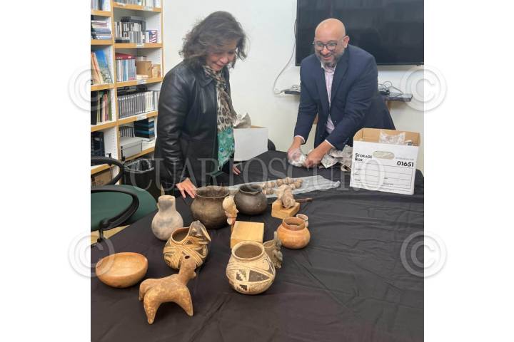 NUEVO MÉXICO, ESTADOS UNIDOS, 20FEBRERO2024.- El día de hoy, el Gobierno de México, a través del Consulado en Albuquerque, Estados Unidos, recibió en restitución 41 piezas arqueológicas de origen mexicano, entregadas voluntariamente por el Departamento de Asuntos Culturales (DAC) de Nuevo México. De acuerdo con un dictamen preliminar elaborado por especialistas del Instituto Nacional de Antropología e Historia (INAH), las piezas pertenecen al patrimonio mexicano, de conformidad a lo que establece la Ley Federal sobre Monumentos y Zonas Arqueológicos, Artísticos e Históricos, y fueron elaboradas por culturas prehispánicas que se asentaron en regiones como el Altiplano Central, el Occidente y el Norte del país, así como en los actuales estados de Oaxaca y Nayarit. De igual manera, su temporalidad se ubica entre los años 200 a 900 d.C. Los objetos arqueológicos fueron entregados por un particular al DAC de Nuevo México, instancia que, al no tener la certeza de la procedencia lícita de las piezas, determinó devolverlos al pueblo de México. FOTO: INAH/SRE/CUARTOSCURO.COM