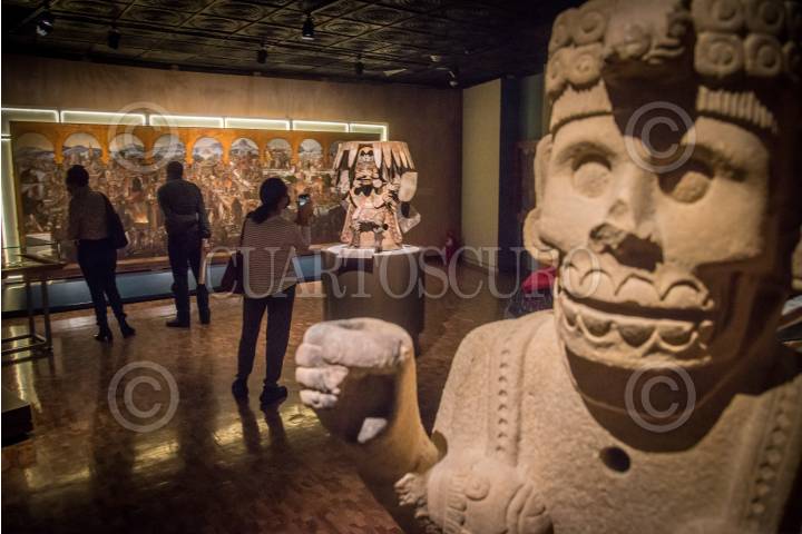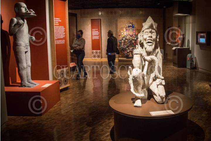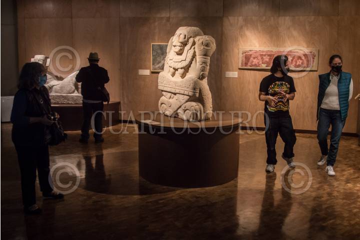 Personas asisten a observar las más de mil 500 piezas arqueológicas que comprenden la exposición “La Grandeza de México” instalada en el Museo Nacional de Antropología.