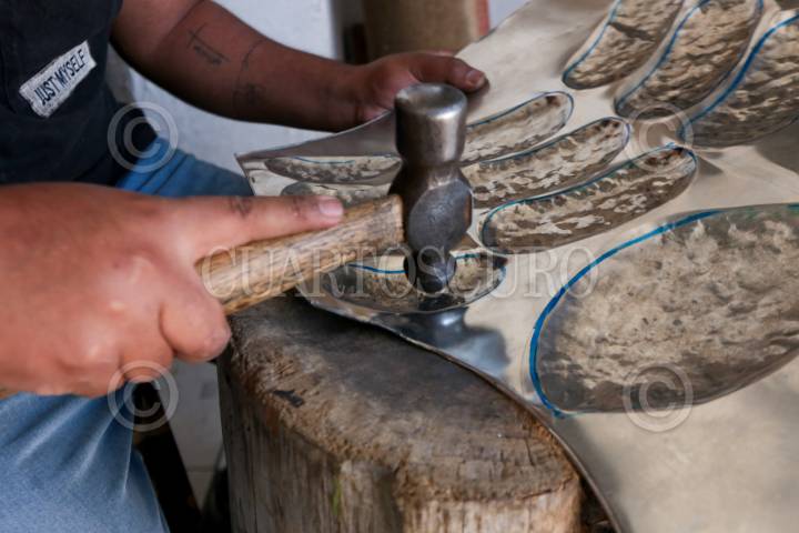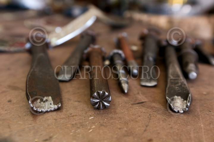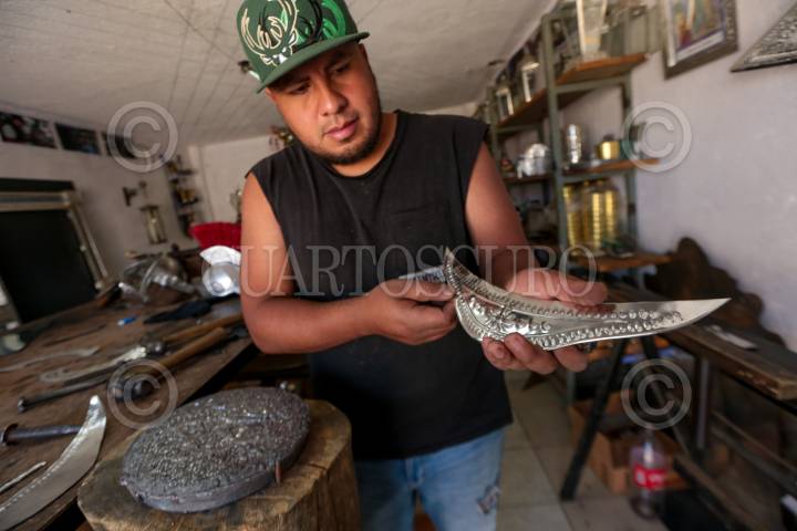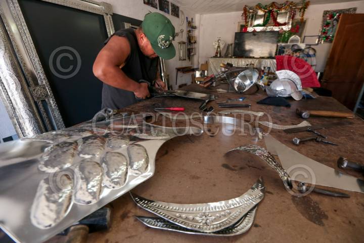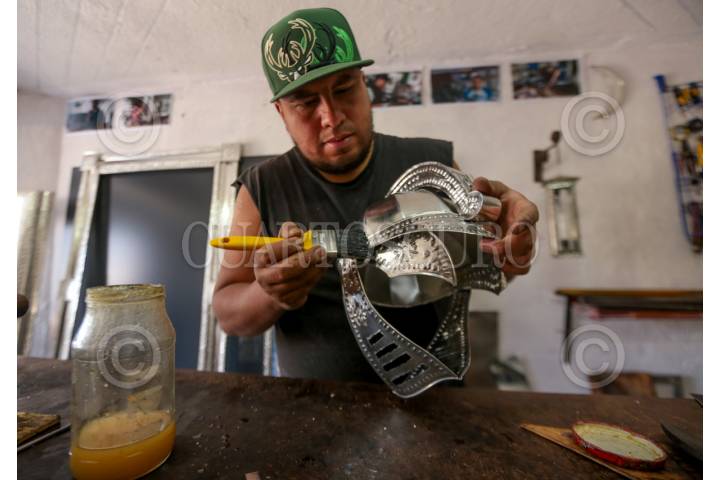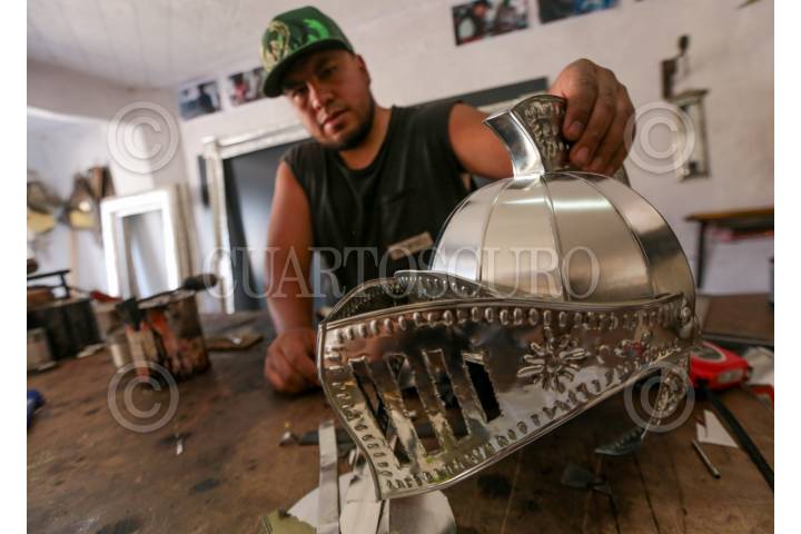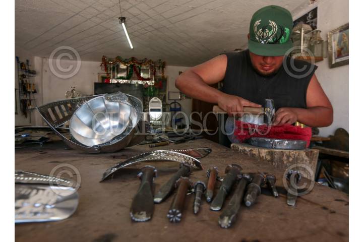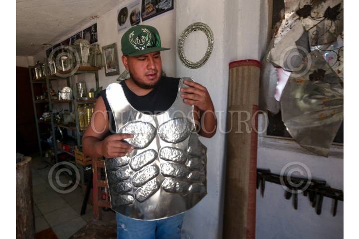 TOLUCA, ESTADO DE MÉXICO, 15ABRIL2025.- Artesanos dedicados a la Metalisteria en la delegación de Cacalomacán, en Toluca, trabajan los cascos y pecheras que serán utilizados para la representación del Viacrucis de Jesús por los soldados romanos; distribuyen su trabajo en lugares como Iztapalapa, Guanajuato y algunos otros municipios mexiquenses. Johnatan Romero continúa con la tradición del taller familiar Romero que tiene más de 50 años dedicándose a este trabajo siendo ya cuatro generaciones, la producción de la indumentaria comienza con mes y medio de anticipación, llegan a elaborar entre 300 y 500 piezas para la Semana Santa. FOTO: CRISANTA ESPINOSA AGUILAR /CUARTOSCURO.COM