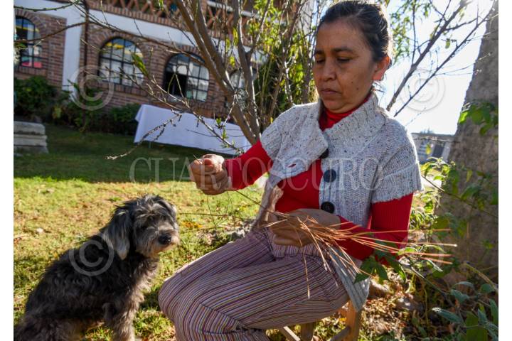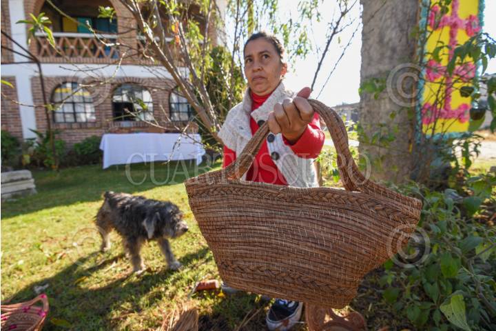 Adriana de Jesús Contreras recolecta hojas de pino, que lava y hierve para hacerlas flexibles. Con aguja e hilo de colores, teje a mano fruteros, tortilleros, canastas y bisutería con ocoxal. Cada pieza puede tomar desde un día hasta un mes, según su tamaño y detalle. En este proceso, participa toda su familia, desde la recolección hasta la venta de las artesanías. FOTO: CRISANTA ESPINOSA AGUILAR / CUARTOSCURO.COM