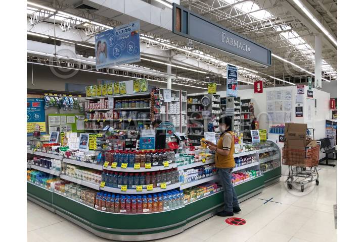 Con señalizaciones en el piso, supermercados indican en cajas y refrigeradores la sana distancia entre clientes.