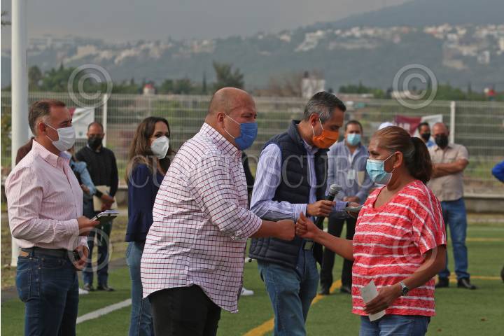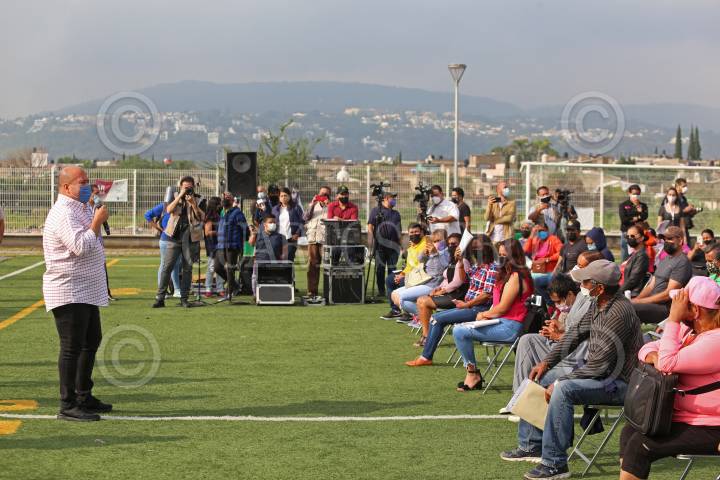 Enrique Alfaro, Gobernador del estado, durante el evento protocolario de entrega de apoyos a familias afectadas por las lluvias hace tres semanas en diversas colonias de Zapopan, esto en el Centro Comunitario La Colmena.