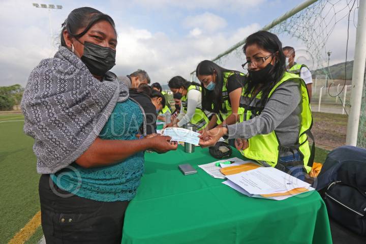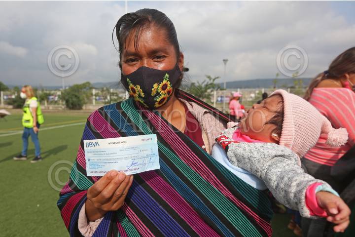 La señora de origen indígena, Laura Guadalupe Blas Santos, durante la entrega del apoyo recibido por el estado en el Centro Comunitario La Colmena, en Zapopan, tras sufrir afectaciones por las lluvias de hace tres semanas en su colonia.