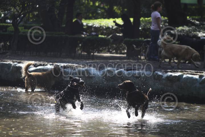 MÉXICO, D.F., 15DICIEMBRE2011.- Dos perros juegan en el Parque México donde los dueños de las mascotas los llevan para que se bañen dentro del lago artificial. FOTO: IVÁN STEPHENS/CUARTOSCURO.COM