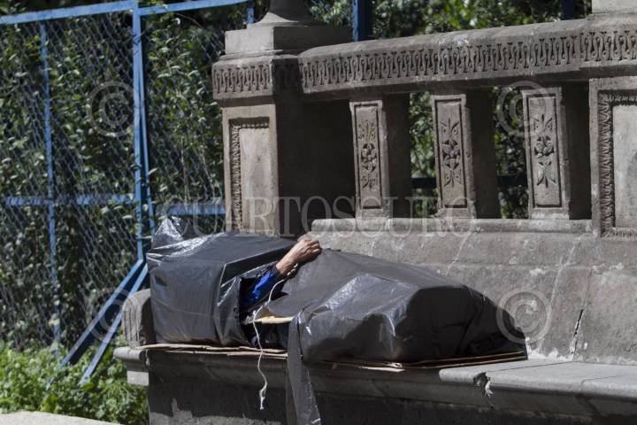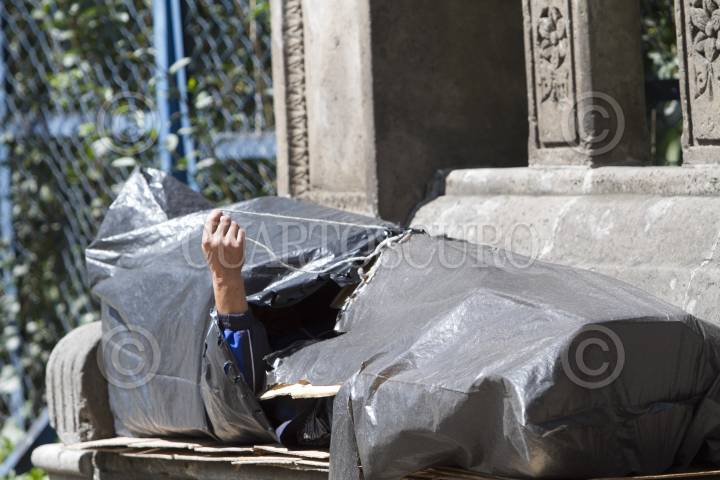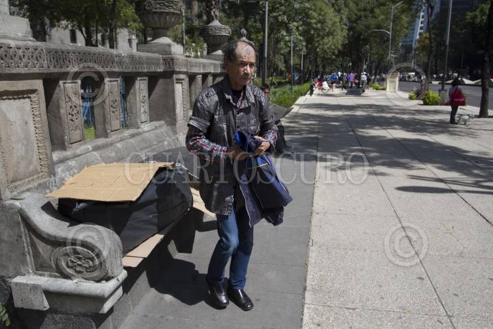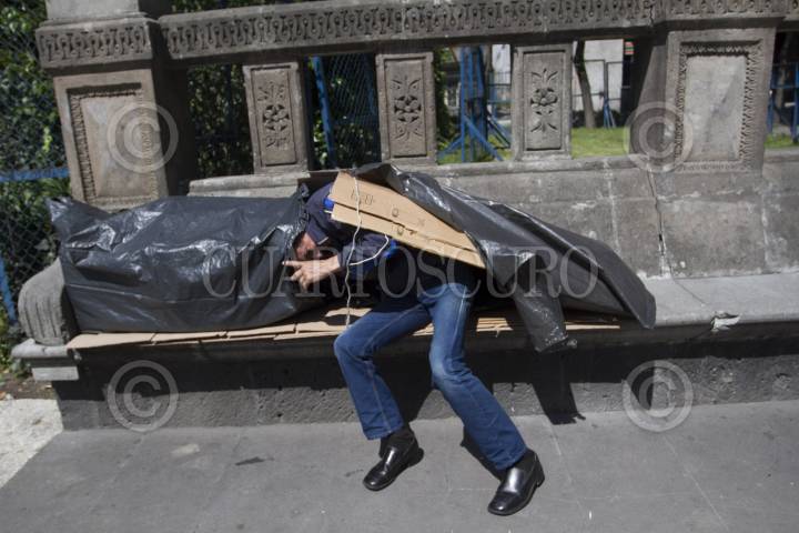 MÉXICO D.F., 03NOVIEMBRE2013.- Un persona sale de entre cartones y plásticos, que están colocados una de las bancas en avenida Paseo de la Reforma y que dan la impresión de un capullo artificial. FOTO: GUILLERMO PEREA /CUARTOSCURO.COM