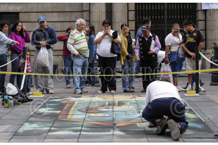 MÉXICO, D.F., 19OCTUBRE2012.- Un artista callejero pinta sobre el piso de la Plaza Tolsá, frente al Museo Nacional de Arte, una réplica de una pintura de Remedios Varo titulada "Papilla Estelar". FOTO: DIEGO SIMÓN SÁNCHEZ /CUARTOSCURO.COM