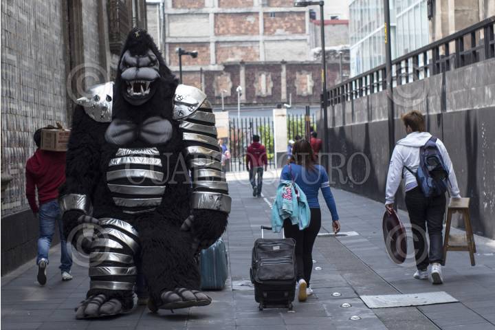 MEXICO, D.F., 22JUNIO2014.- Una botarga y artistas callejeros caminan hacia la calle Madero en el centro histórico. FOTO: DAVID POLO /CUARTOSCURO.COM