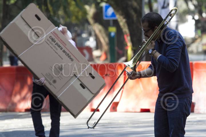 CIUDAD DE MÉXICO, 08DICIEMBRE2016.- Joven músico toca el trombón en las calles de la Colonia Condesa, quien con sus notas músicales ameniza a los comensales. FOTO: MOISÉS PABLO /CUARTOSCURO.COM