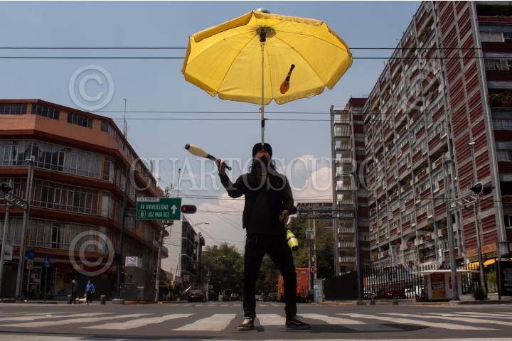 Luis Flores, artista callejero, realiza malabares entre los cruces de Avenida Coyoacán y Avenida Felix Cuevas, en la Alcaldía Benito Juárez, en busca de algunas monedas que lo ayuden a solventar sus gastos ante la pandemia por COVID-19.