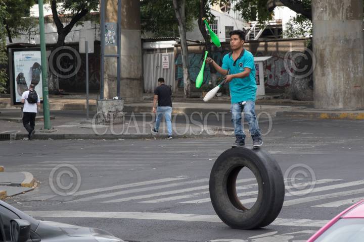 Un joven hace malabares sobre una llanta para ganarse la vida en avenida Patriotismo.