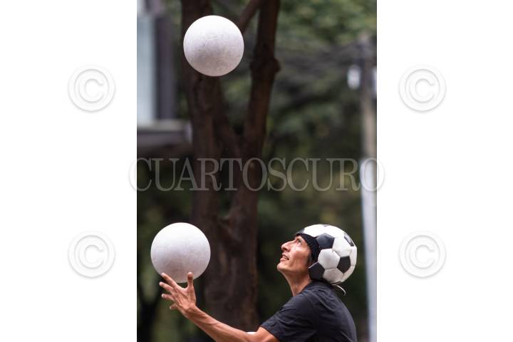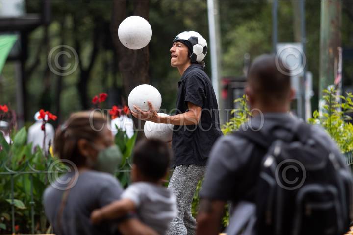 Malabarista urbano realiza su acto con tres balones a los transeúntes de la colonia Condesa.